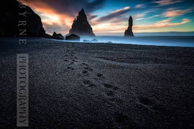 As the sun appeared from the horizon behind the clouds it produced some stunning colours. My exposure had to be spot on for this as I wanted enough to expose the footsteps on the black beach but not too much to blow out the sky. To help me I used my Lee 1 x Big Stopper and my Formatt Hitech Neutral Density (ND) 0.9 Soft Graduated Filter.